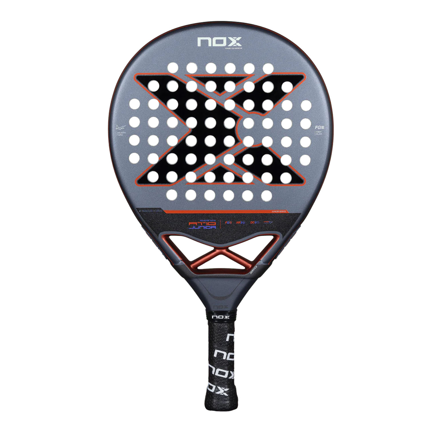 С уменьшенными размерами и весом от 300 до 325 г, ракетка Nox AT10 Genius JR позволяет юным игрокам играть плавно и точно с первых матчей. Ее углеродная структура, сердечник HR3 и поверхности из Fiber Glass 3K обеспечивают отличный отскок мяча, прочность и мягкое прикосновение, а матовое покрытие усиливает ощущение контроля. Кроме того, ракетка украшена подписью Tapia в качестве символа вдохновения.